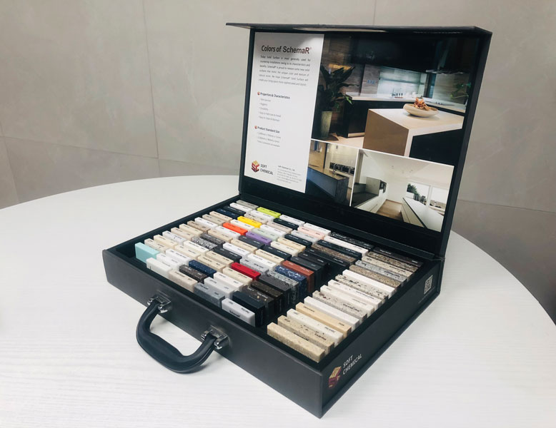 این جعبه ها حاوی نمونه هایی از انواع مختلف سنگ از جمله گرانیت، مرمر، کوارتز و یا سایر سنگ های طبیعی و مصنوعی می باشد.هر نمونه معمولاً یک قطعه کوچک و صیقلی است که رنگ، بافت و الگوی صفحات کامل سنگ را به نمایش میگذارد و به مشتریان کمک می کنند تا ویژگی ها و تغییرات ذاتی در انواع مختلف سنگ ها را درک کنند.آنها ممکن است شامل اطلاعاتی در مورد دوام، الزامات نگهداری و سایر جزئیات مربوط به هر نوع سنگ باشند.