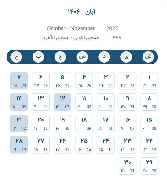 تقویم آبان ۱۴۰۶ – تقویم برج هشتم ۱۴۰۶