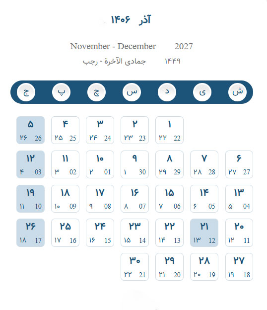 تقویم آذر ۱۴۰۶ – تقویم برج نهم ۱۴۰۶