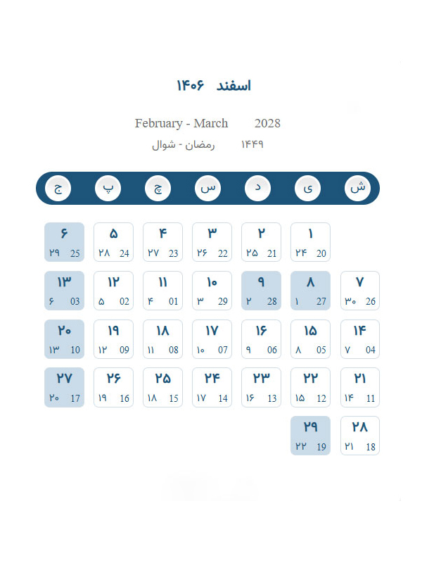 تقویم اسفند ۱۴۰۶ – تقویم برج دوازدهم ۱۴۰۶