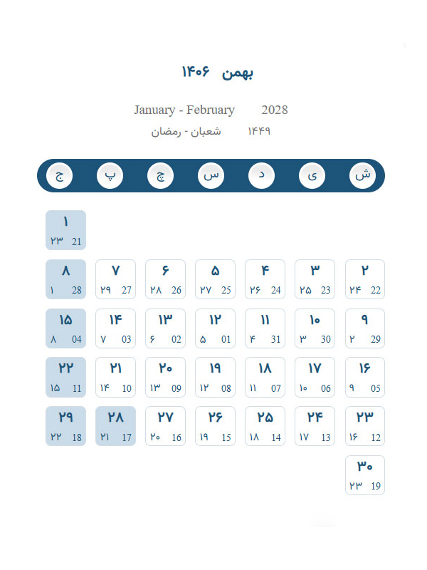 تقویم بهمن ۱۴۰۶ – تقویم برج یازدهم ۱۴۰۶