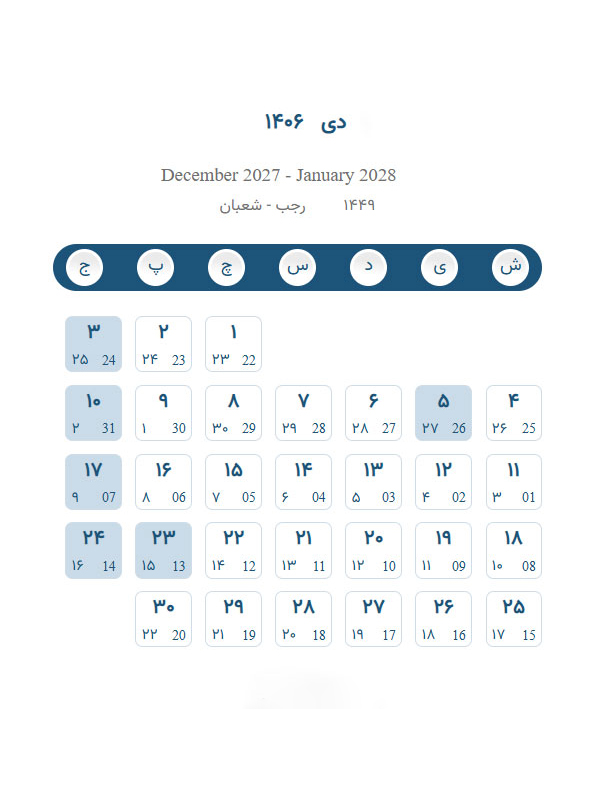تقویم دی ۱۴۰۶ – تقویم برج دهم ۱۴۰۶