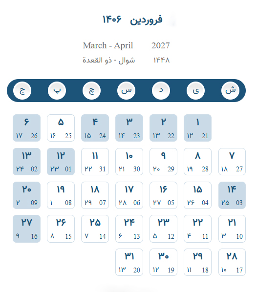 تقویم فروردین ۱۴۰۶ – تقویم برج یک ۱۴۰۶